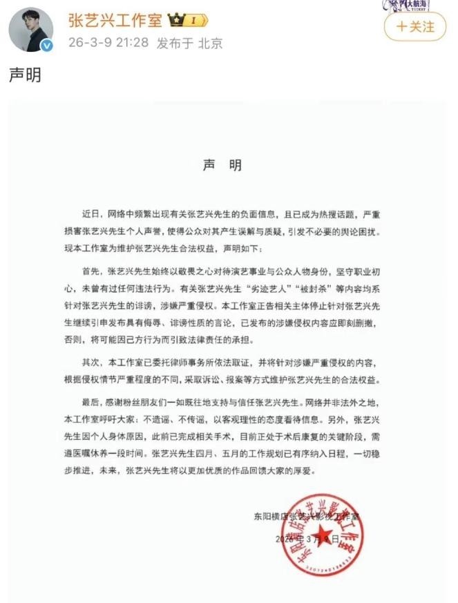 第二重说明:近期公开露面频率降低,系因接受微创手术治疗,现正处于医嘱静养阶段,全力恢复健康状态。