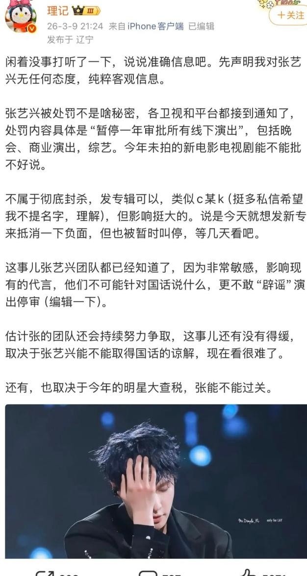 不料,辟谣发布不足四十八小时,前调查类博主“理记”再度发文,坚称“演出审批冻结”确有其事,并暗示张艺兴团队对此早有知情与应对预案。